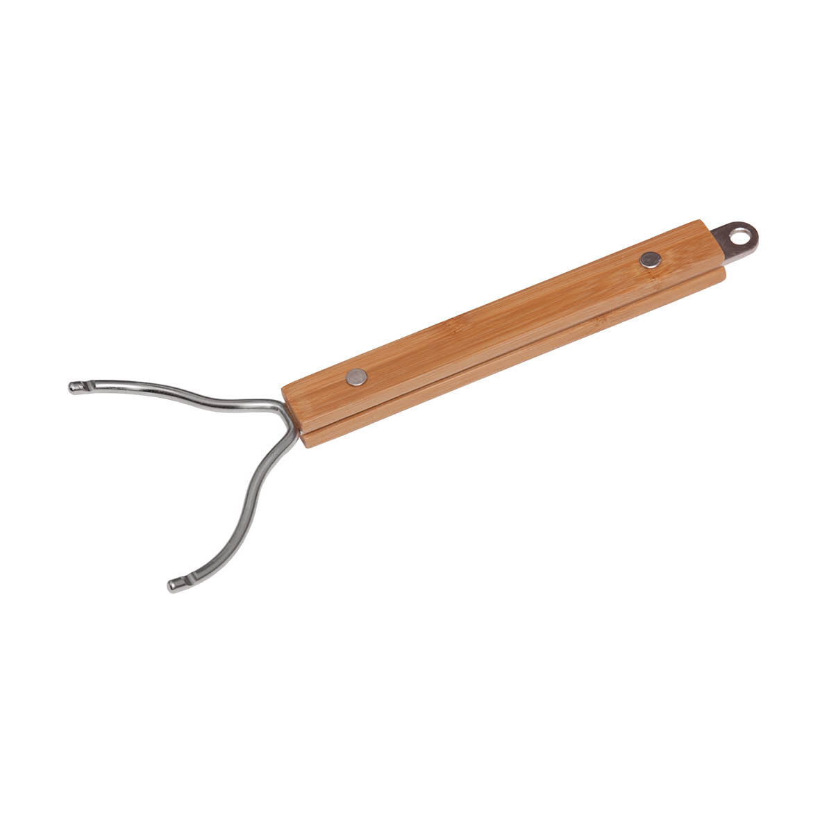 Robuuste barbecueroosterheffer van roestvrij, gepolijst staal met bamboegreep voor veilig en eenvoudig opheffen en verwijderen van het barbecuerooster. Geschikt voor roestvrij stalen en gietijzeren roosters.